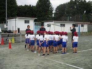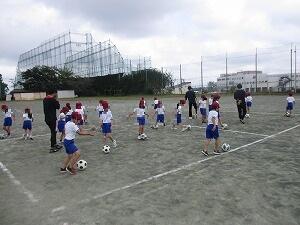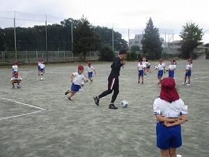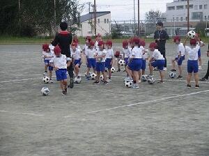 本日、JFAキッズプログラムのサッカー教室が実施されました。指導者が2名来てくださり、サッカーボールを使っての体ならしやドリブルの練習をしました。指導者の教えで、子供たちは上手にドリブルができるようになりました。最後の試合では、サッカーボールを3つ使用して試合をしました。男の子も女の子も協力しながら走り回りました。最後に見せた笑顔が、微笑ましかったです。指導者の方に心から感謝します。