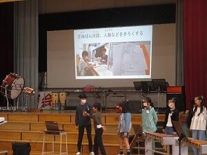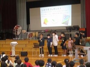 今月の発表は、図書委員会です。委員一人一人の自己紹介後に、図書委員会のお仕事やクイズ、おすすめの本の紹介がありました。おすすめの本の紹介では、読んでみたいという気持ちになるくらい、詳しくあらすじを紹介してくれました。図書委員会の子供たちに感謝します。