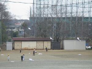 1年生が生活科の授業でつくった凧を、校庭であげていました。風が程よく吹いており、子供たちは笑顔で楽しそうに凧をあげていました。