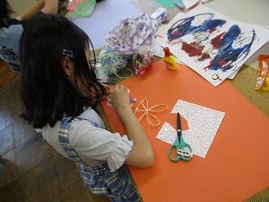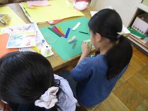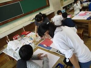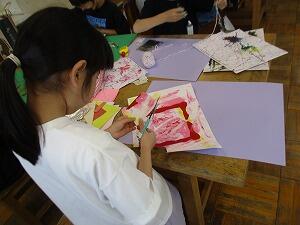 4年生の図画工作「はる はる はる絵」の授業です。子供たちは、先週絵の具で描いた模様と、毛糸や布など自宅から持ってきた材料を切り取って組み合わせ、はり絵にします。完成した作品を見るのが楽しみです。