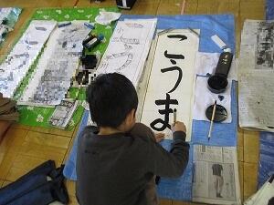 3年生は書きぞめの授業で、「こうま」を書きます。先生の指示に従って、一人一人が真剣に書いていました。
