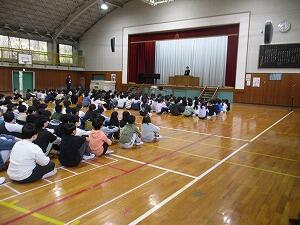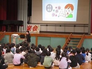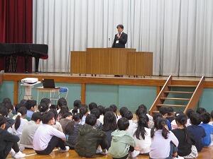 12月の学校朝会は、開始前の待つ姿勢がすばらしかったです。一言もしゃべらずに待つことができていました。今月は、「天才は努力するものには勝てない。努力するものは楽しむものには勝てない」という論語の中にある言葉について話しました。子供のころ嫌々やっていた掃除が、現在は楽しめるようになった経緯についても例に出して話しました。その後は、先月の生活目標の振り返りと、今月の生活目標「健康に気をつけて生活しよう」について、担当の先生から話がありました。