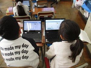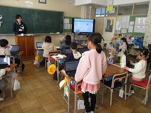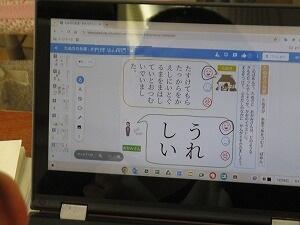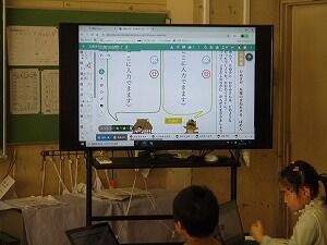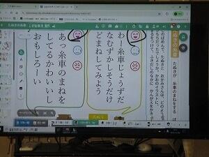 1年生国語の授業! 投稿: 校長 (12/08) 1年生の国語「たぬきの糸車」の授業です。今日は、たぬきが糸車の真似をする場面について、たぬきとおかみさんの気持ちになって考えました。クロームブックで一人一人が書いた気持ちを大型スクリーンに表示し、お友達の考えた気持ちと自分の考えた気持ちを比べました。