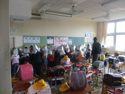 安全をより確かなものにする訓練 投稿: 校長 (16:49) カテゴリー: 学校行事 本日は引渡し訓練へのご協力ありがとうございました。 災害時の対応を定期的に実際に体験することは大切なことです。 この機会にご家庭での備えについてもお子様と一緒に確認しておくとよいかと思います。 (机の下に避難しています) (防災頭巾をかぶり移動します)