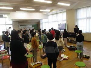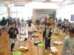 4年生の音楽「ゆかいに歩けば」の授業です。はじめは全員で歌い、次にリズムに合わせて歩きながら歌いました。私も一緒に参加しましたが、とても楽しかったです。