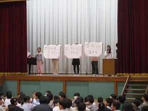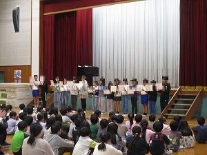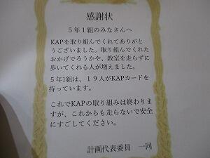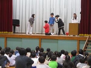 今月の児童朝会は、保健委員会が発表しました。実際にけがをした時の対応を、劇とクイズでわかりやすく説明してくれました。子供たちが考えていたけがの対応以外のことがあり、みんな驚いていました。今回の朝会を踏まえ、けがをした時の正しい対応を今後してくれると思います。保健委員会のみなさん、ありがとうございました。保健委員会の発表後に、計画代表委員会が全校で取り組んできた「KAP(北中安全プロジェクト)」の終了と表彰についての説明がありました。廊下でのけがが例年より少なかったことは、計画代表委員会の提案のおかげです。ありがとうございました。